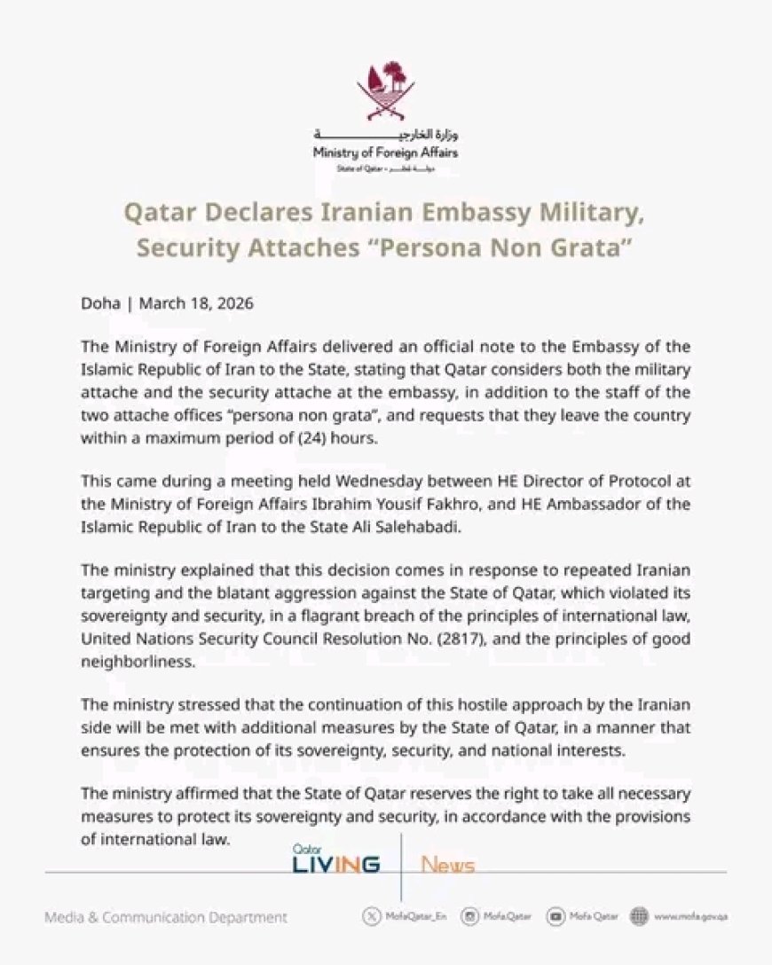 Minisiteri y'ububanyi n'amahanga ya Qatar yatangaje ko buri munya Iran wakoraga mu biro bya gisirikare no mu zindi nzego z'umutekano bizwi mu rurimi rw'amahanga nka Military & security attaches I Doha mu murwa mukuru wa Qatar bambuwe uburenganzira bwo gukomeza kuba muri iki gihugu.