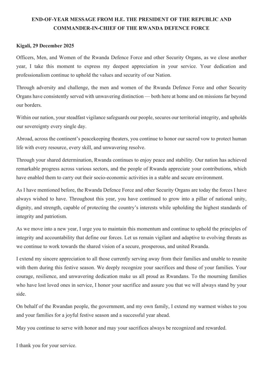 Kigali, 29 December 2025 Officers, Men, and Women of the Rwanda Defence Force and other Security Organs, as we close another year, I take this moment to express my deepest appreciation in your service. Your dedication and professionalism continue to uphold the values and security of our Nation.