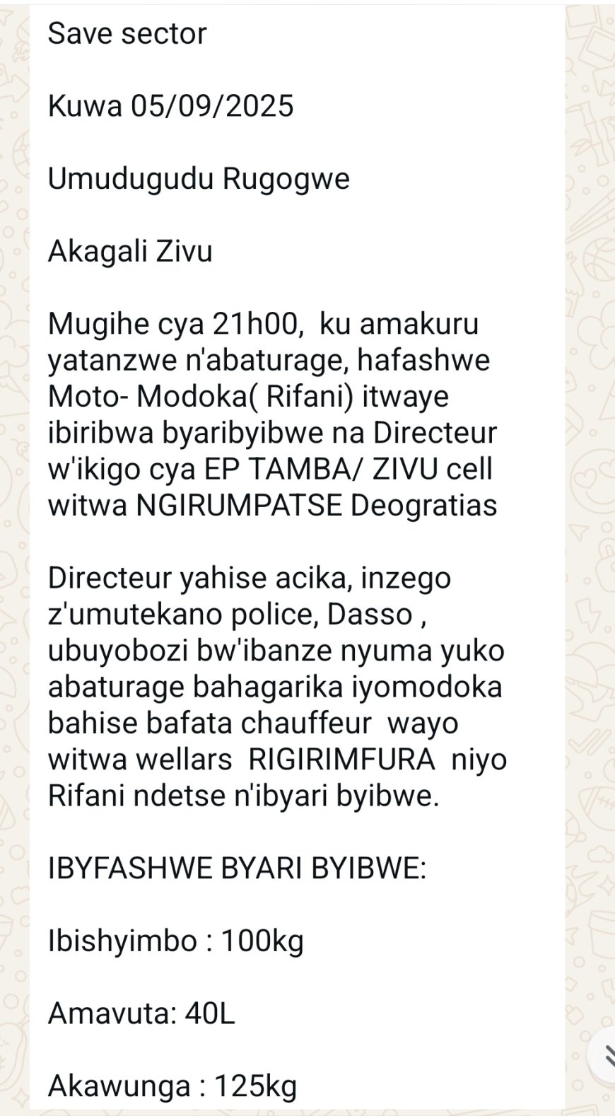 Save, mu karere ka Gisagara Umuyobozi w'Ishuri Ribanza rya Tamba, Ngirumpatse Déogratias, yafashwe mu ijoro ryacye ejo avuye "kwiba" ibiryo by'abanyeshuri birimo 100kg by'ibishyimbo, 40L z'amavuta yo guteka na 125kg bya kawunga; "amaguru ayabangira ingata"