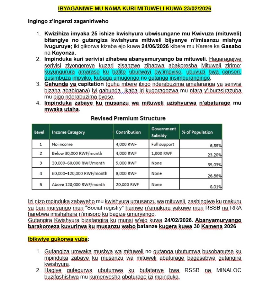 Igazeti ya Leta ya y’u Rwanda (Official Gazette of the Republic of Rwanda) yasohotse ku wa 23 Gashyantare 2026 yemeje ibiciro bishya by’ubwisungane mu kwivuza (Mutuelle de Santé), ihamya ko amakuru yavugwaga ko umuturage azajya yishyura ibihumbi 60,000 Frw ari ibihuha bidafite ishingiro.