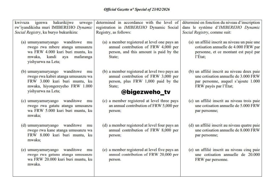 Hasingiwe ku Iteka rya Minisitiri Nº 002/26/10/TC ryo ku wa 16/02/2026 rishyiraho ingano n’uburyo bwo gutanga umusanzu w’ubwisungane mu kwivuza Leta y’u Rwanda yatangaje ko buri munyamuryango azajya atanga umusanzu ku mwaka hakurikijwe urwego abarizwamo: