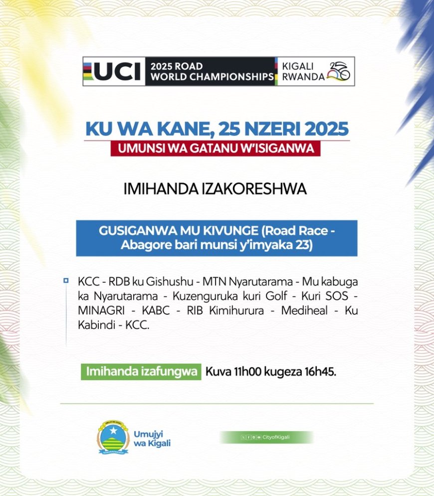 Muzaze tubashyigikire muri benshi nkuko bisanzwe ku mihanda bazakoresha ndetse no kuri KCC-Kigali Heights aho bazahagurukira akaba ari na ho basoreza. Imihanda izafungwa: Kuva 11h00 kugeza 16h45.