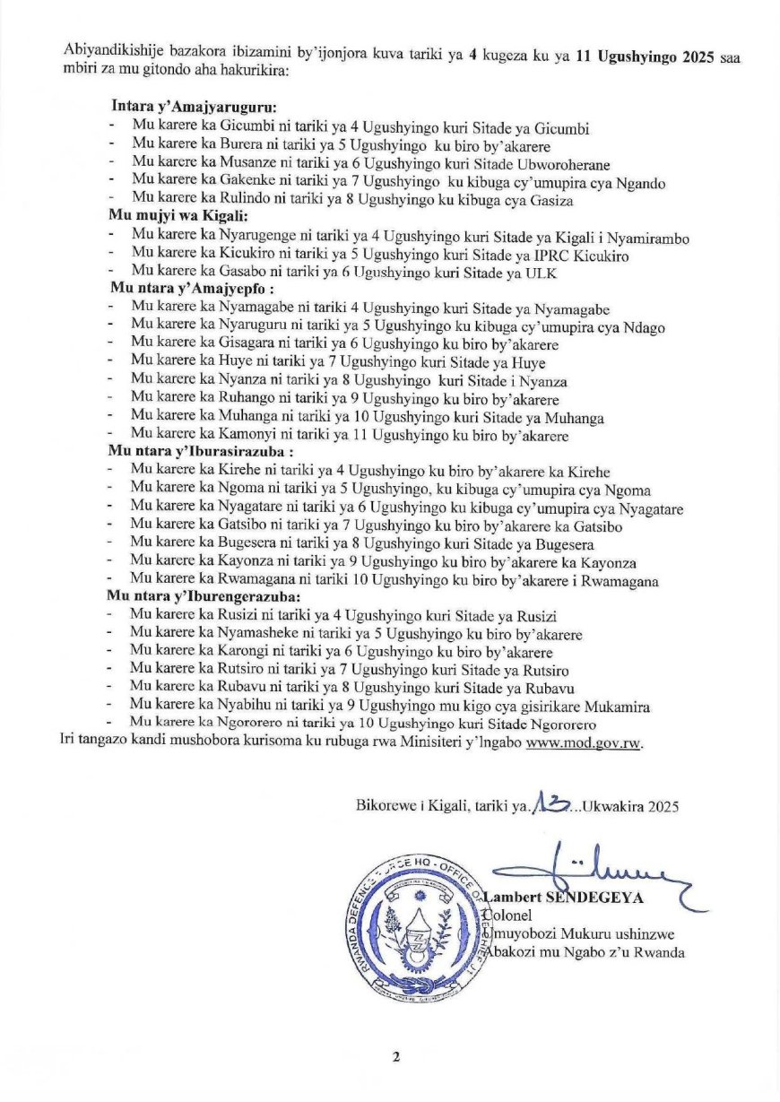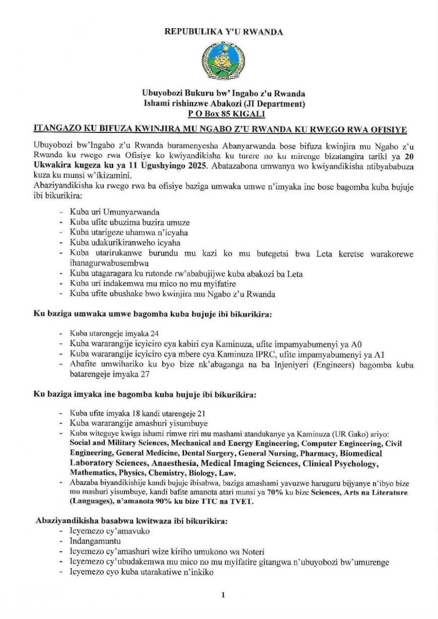 Ubuyobozi bw’Ingabo z’u Rwanda (RDF), bwasohoye itangazo rihamagarira abasore n’inkumi babishaka bari hagati y’imyaka 18 na 21, kwiyandikisha kugira ngo binjire mu Ngabo z’u Rwanda ku rwego rwa ba Ofisiye.