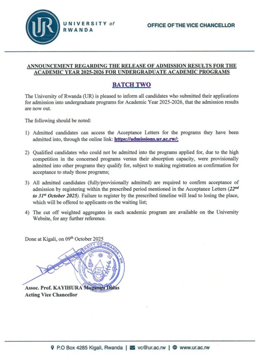 ITANGAZO RIGENEWE ABASABYE KWIGA MURI KAMINUZA Y'URWANDA (BATCH TWO) 2025-2026
