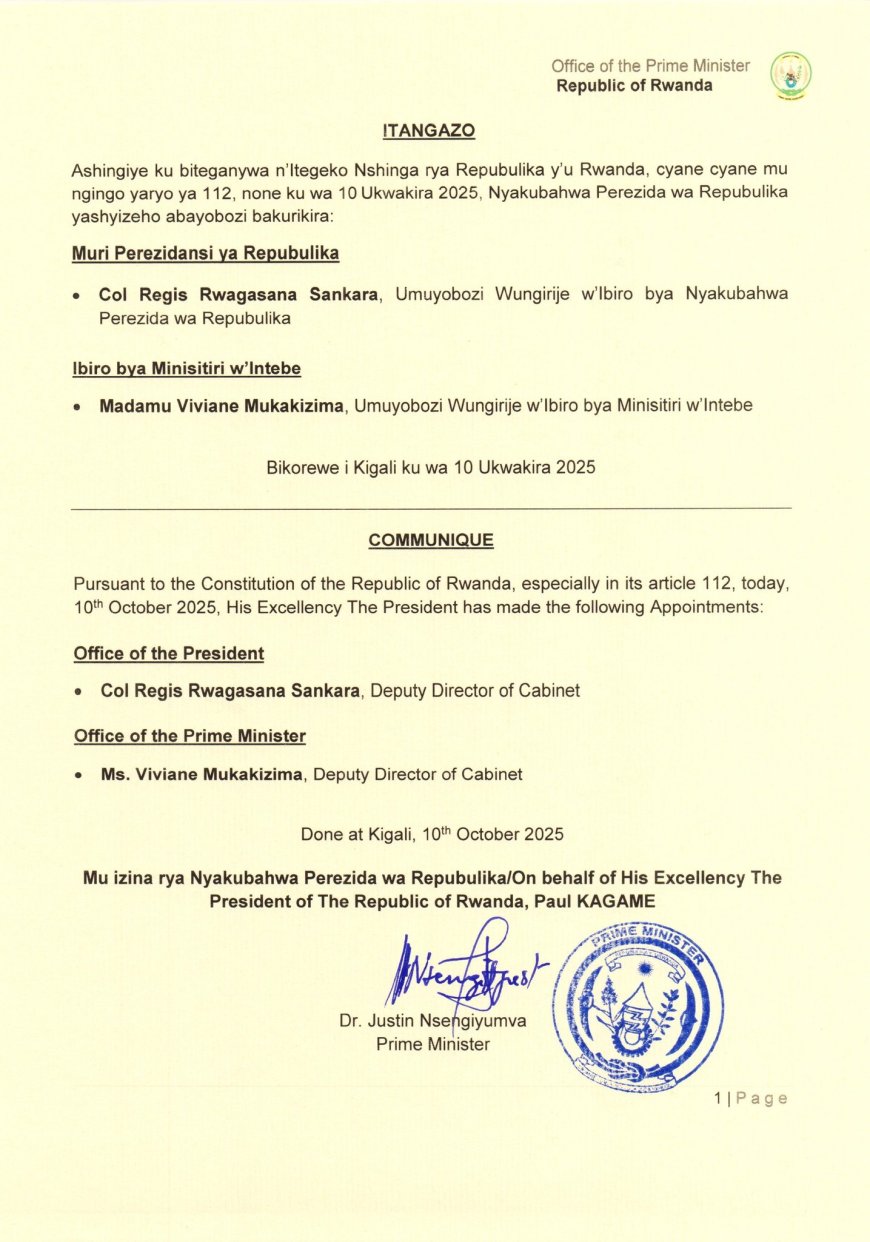 Ashingiye ku biteganywa n'Itegeko Nshinga rya Repubulika y'u Rwanda, cyane cyane mu ngingo yaryo ya 112, none ku wa 10 Ukwakira 2025, Nyakubahwa Perezida wa Repubulika yashyizeho abayobozi bashya