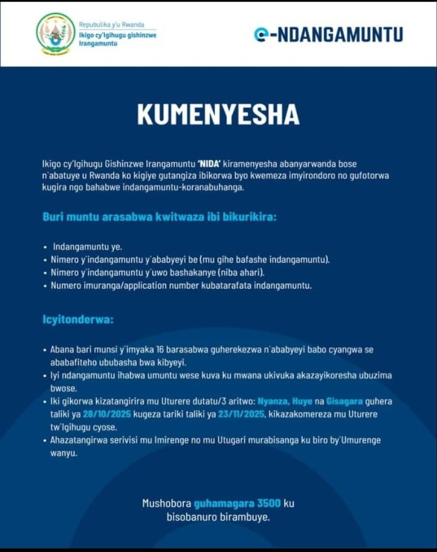 Ikigo k'igihugu gishinzwe indangamuntu kiramenyesha abaturarwanda bose ko umushinga wo gukora indangamuntu koranabuhanga watangiye