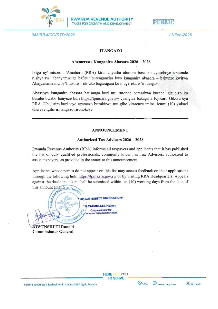 Ikigo cy'Imisoro n'Amahoro (RRA) kiramenyesha abasora bose ko cyasohoye urutonde rushya rw' abanyamwuga bafite uburenganzira bwo kunganira abasora bakunze kwitwa Abajyanama mu by'Imisoronk'uko bagaragara ku mugereka w'iri tangazo.