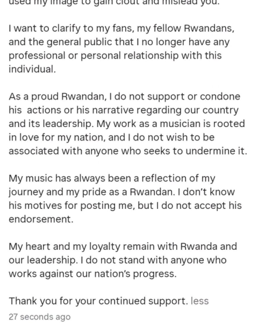 Marina yahaye gasopo uyu mugabo wahoze ari umujyanama we muri The mane yafashaga abahanzi kuri uyu mugoroba wo kuwa 20 Mata 2026,amubwira ko adakwiriye kujya amwita umukobwa we kuko yafashe uruhande rubi rwo kwitandukanya n'abandi banyarwanda mu kubaka igihugu.