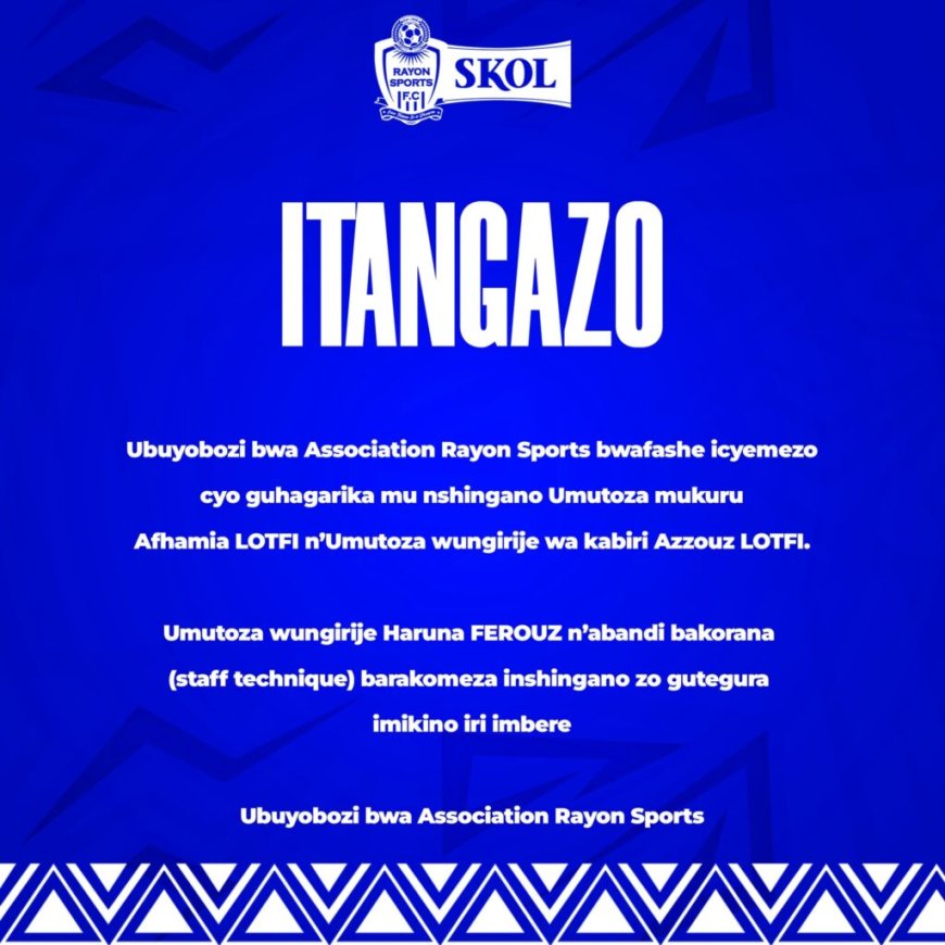 itangazo Rayon Sports yashyize ku mbuga nkoranyambaga ryagiraga riti,”Ubuyobozi bwa Association Rayon Sports bwafashe icyemezo cyo guhagarika mu nshingano Umutoza mukuru Afhamia Lotfi n’Umutoza wungirije wa kabiri Azzouz Lotfi.”