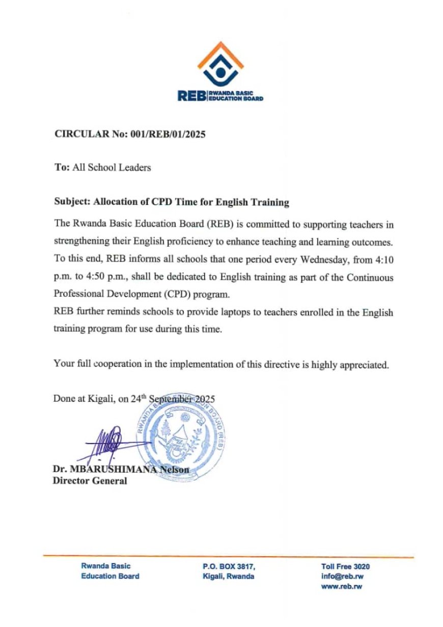 Kubera iyo mpamvu, REB iramenyesha amashuri yose ko buri wa Gatatu guhera saa kumi n’iminota icumi (4:10 p.m.) kugeza saa kumi n'iminota mirongo itanu (4:50 p.m.) hagomba kuba isaha yihariye igenewe amasomo y’Icyongereza nk’igice cy’ibikorwa byo gukomeza guhugura abarimu (Continuous Professional Development – CPD).