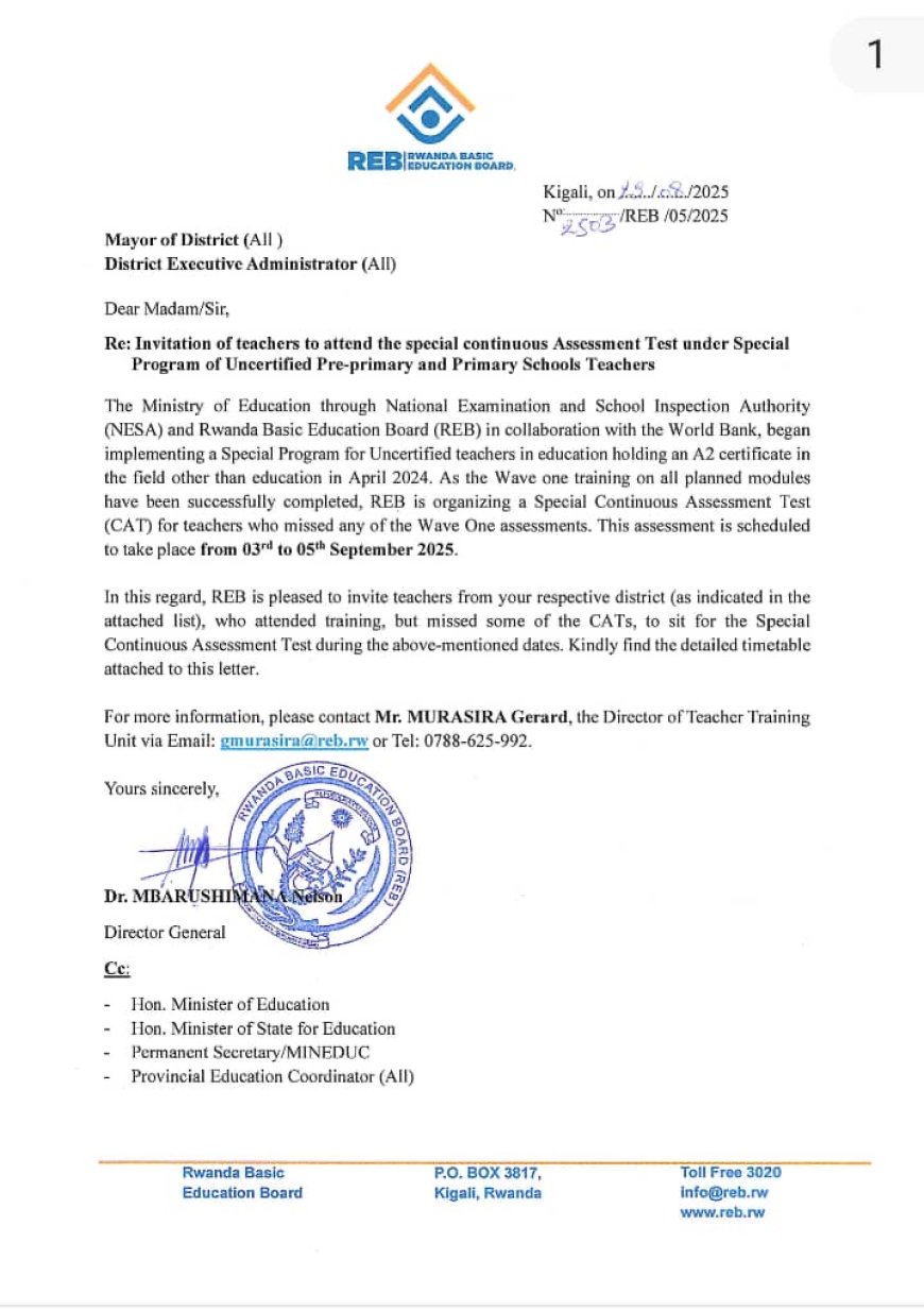 REB Itangazo rigenewe Abarimu batize uburezi bacikanwe na Assessments wave 1