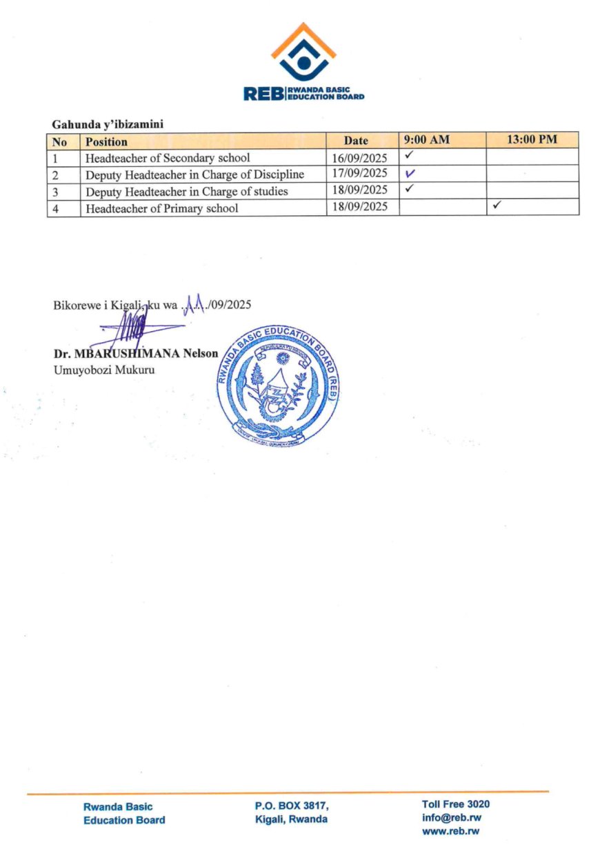 Urwego rw'lgihugu rushinzwe Uburezi bw'Ibanze (REB) ruramenyesha abakandida bose bakoze