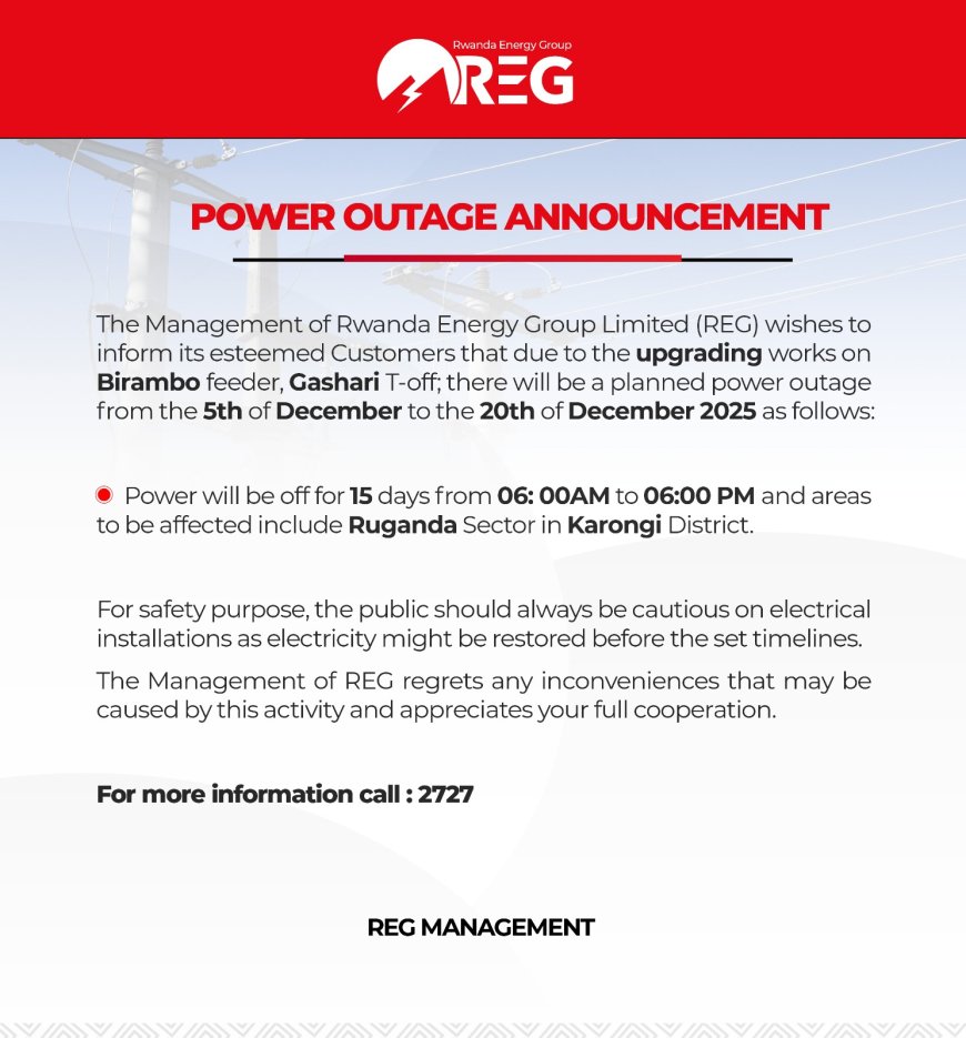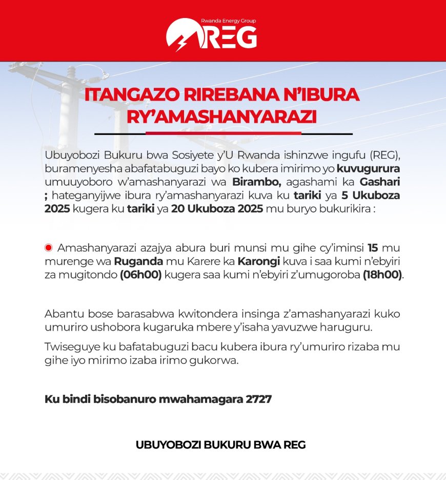 Kubamenyesha ibura ry'amashanyarazi riteganyijwe mu gihe cy'iminsi 15, uhereye tariki ya 5 Ukuboza kugeza tariki 20, 2025, mu Murenge wa Ruganda mu karere ka Karongi