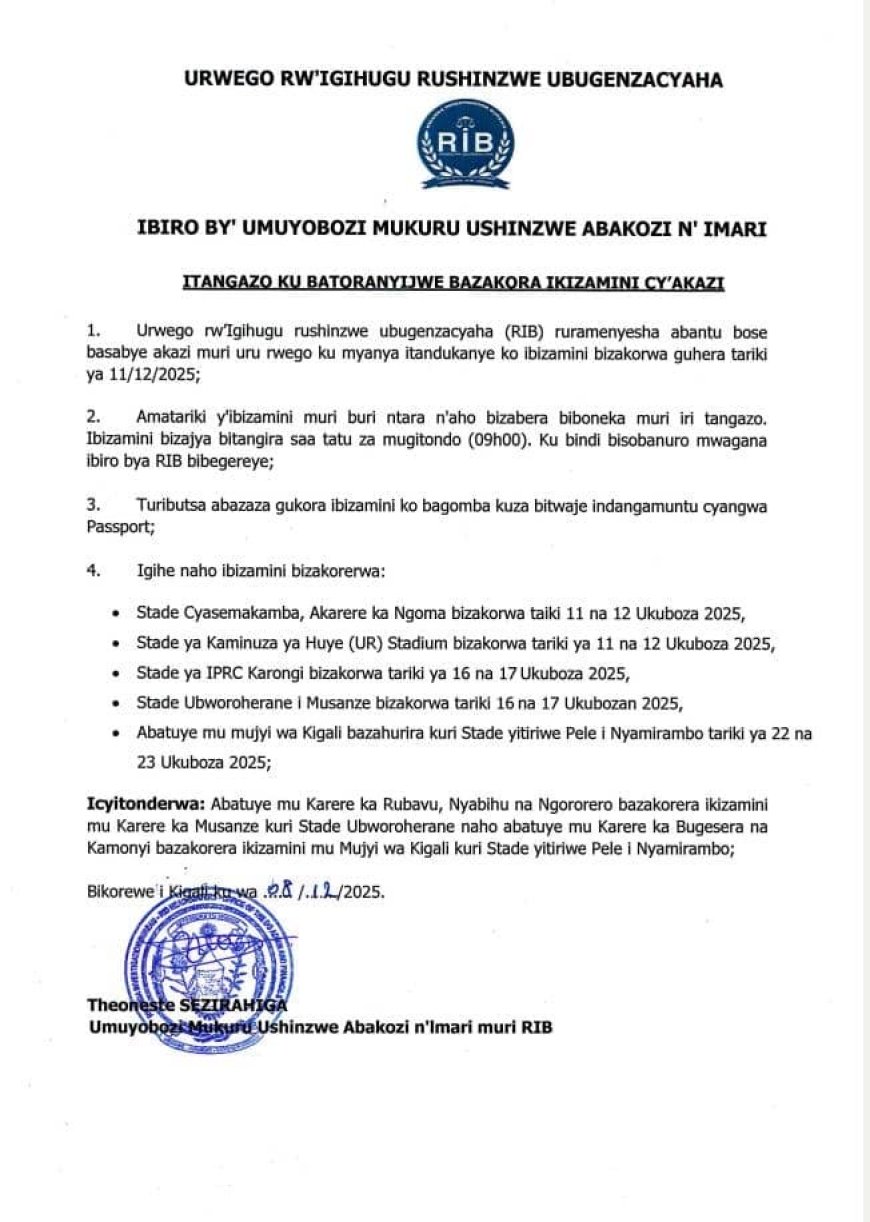 RIB: ITANGAZO KU BATORANYIJWE BAZAKORA IKIZAMINI CY’AKAZI 2025