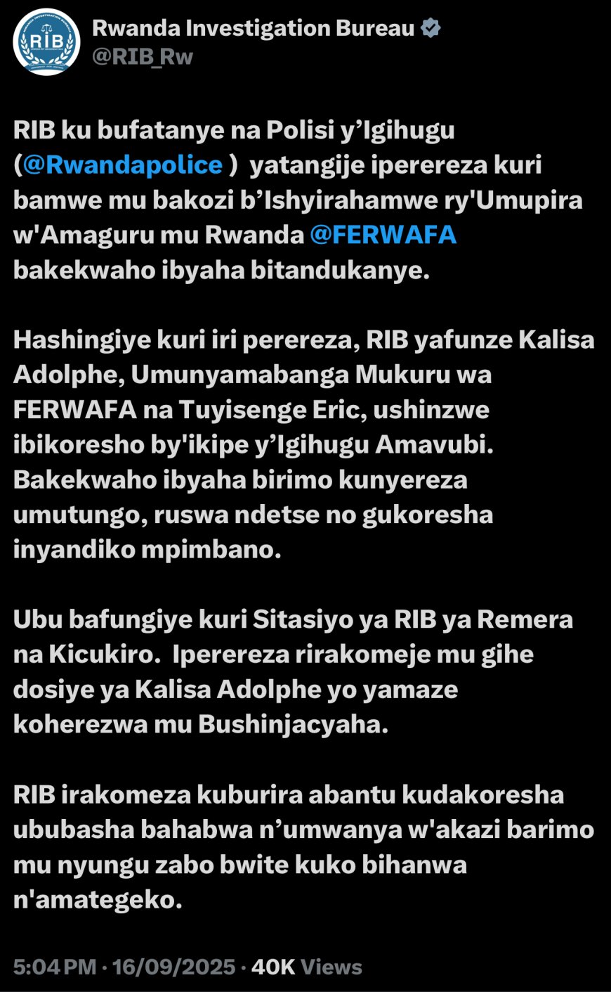 Kuri wa Kabiri, RIB ibinyujije ku rubuga rwa X yanditse iti: ”RIB ku bufatanye na Polisi y’Igihugu yatangije iperereza kuri bamwe mu bakozi b’Ishyirahamwe ry'Umupira w'Amaguru mu Rwanda, FERWAFA, bakekwaho ibyaha bitandukanye”.