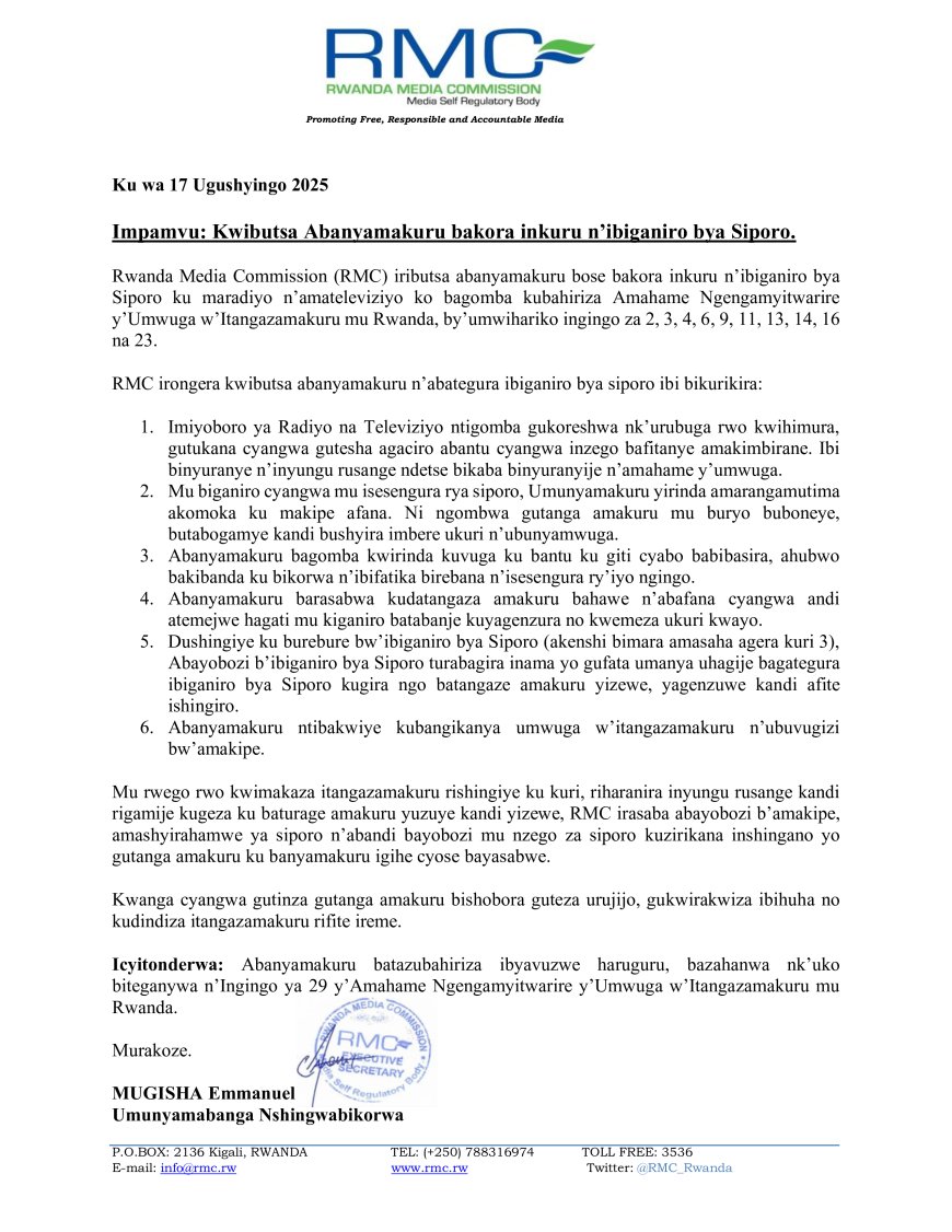 Mu itangazo ryatanzwe na Rwanda Media Commission (RMC), hibanzwe cyane ku kwibutsa abanyamakuru bakora inkuru za siporo kudatandukira mu gihe bari mu busesenguzi ndetse mbere yo gutangaza inkuru bakajya babanza kumenya ko ari ukuri.